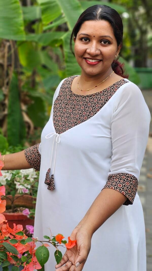‘Blossoms’ Ajrakh Yoke White Georgette Kurti