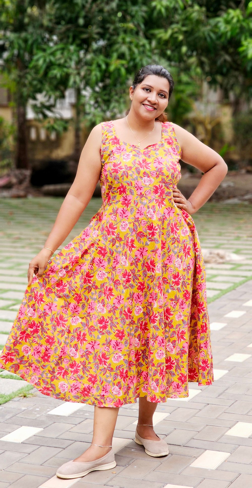 Floral Printed Sleeveless Yellow Cotton Flair Dress