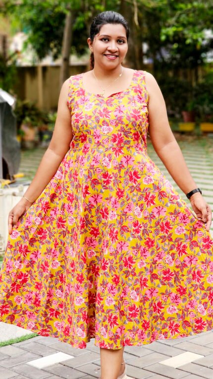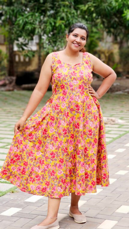 Floral Printed Sleeveless Yellow Cotton Flair Dress